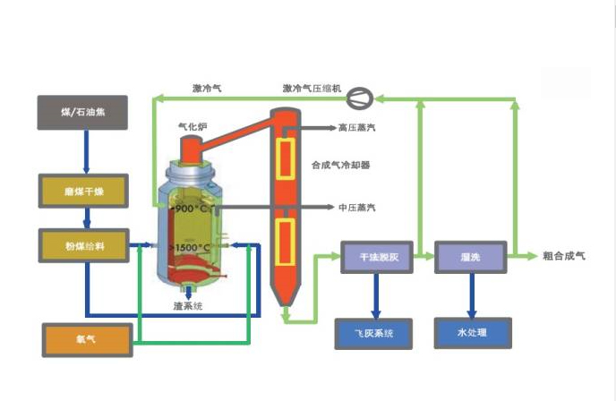干粉氣化工藝的基本過(guò)程:原煤加助燃劑,破碎磨成煤粉,由高壓氮?dú)饬鬏斔瓦M(jìn)氣化爐,在壓力4.1 MPa、溫度1500—1600℃的條件下,與配加的氧氣和水蒸汽瞬時(shí)完成揮發(fā)分脫除、裂解、燃燒及轉(zhuǎn)化的一系列物理化學(xué)過(guò)程,氣化產(chǎn)物為粗合成氣,煤灰熔化以液態(tài)流出。