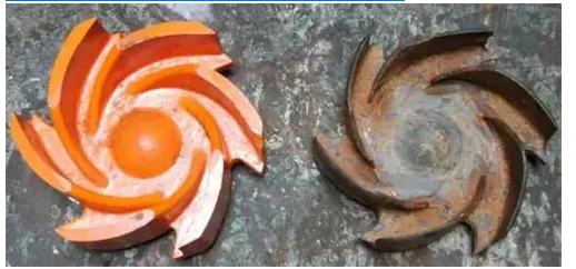 水泵壁面在高強度沖擊力的反復(fù)作用下,金屬表面產(chǎn)生局部變形與硬化變脆,產(chǎn)生金屬疲勞現(xiàn)象,使金屬破裂與剝落。除力學(xué)作用外,還夾雜著水體中逸出的深入活潑氣體(如氧氣)對金屬的化學(xué)腐蝕以及水體對金屬的電化學(xué)腐蝕等。在綜合作用下,水泵壁面起初是出現(xiàn)麻點,繼而變成蜂窩狀,嚴(yán)重時壁面會在短期內(nèi)被擊空。