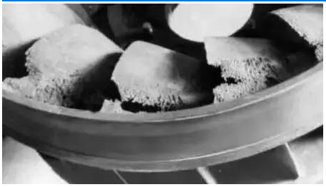 氣泡潰滅時,液體質(zhì)點互相撞擊,同時也撞擊金屬表面,產(chǎn)生各種頻率的噪聲,嚴(yán)重時可聽見泵內(nèi)有“劈啪”的爆炸聲,同時引起機組振動。葉輪局部在巨大沖擊的反復(fù)作用下,表面出現(xiàn)斑痕及裂紋,甚至呈海綿狀逐漸脫落,降低了泵使用壽命。