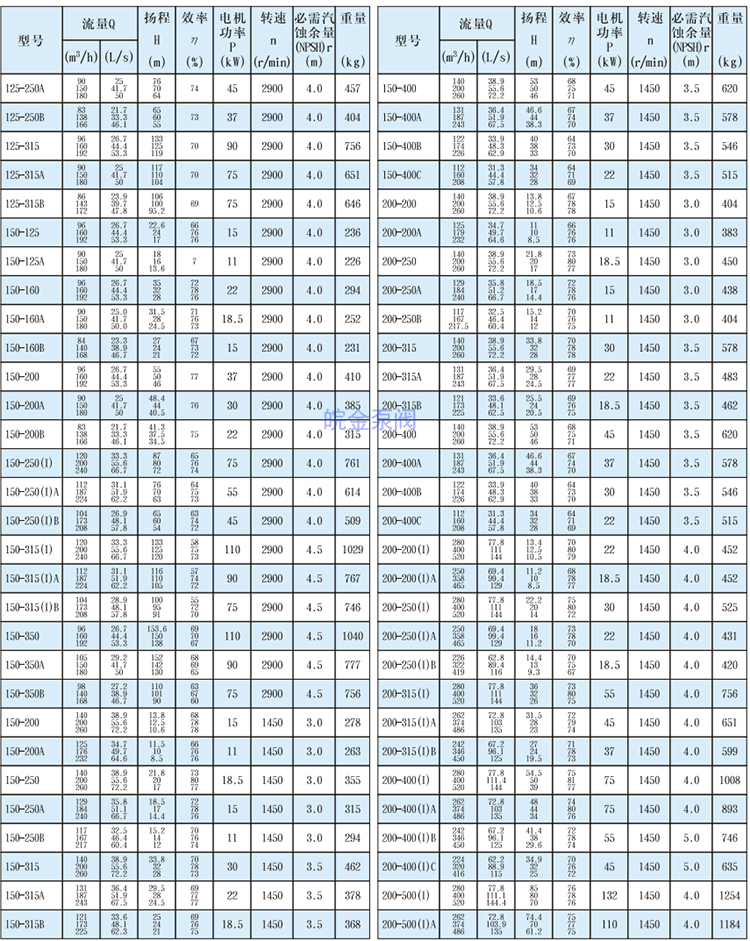 皖金泵閥立式管道離心泵主要參數(shù):