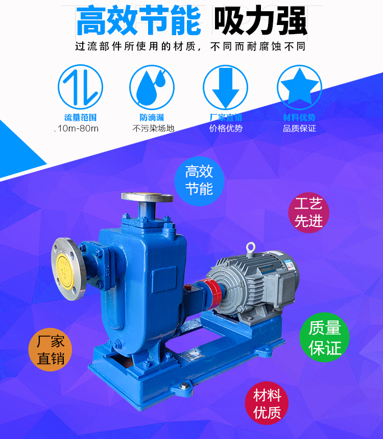 2、高效節(jié)能:采用優(yōu)秀水力模型,效率比一般自吸泵高3~5%;